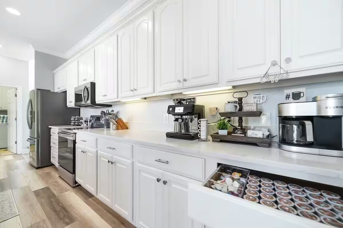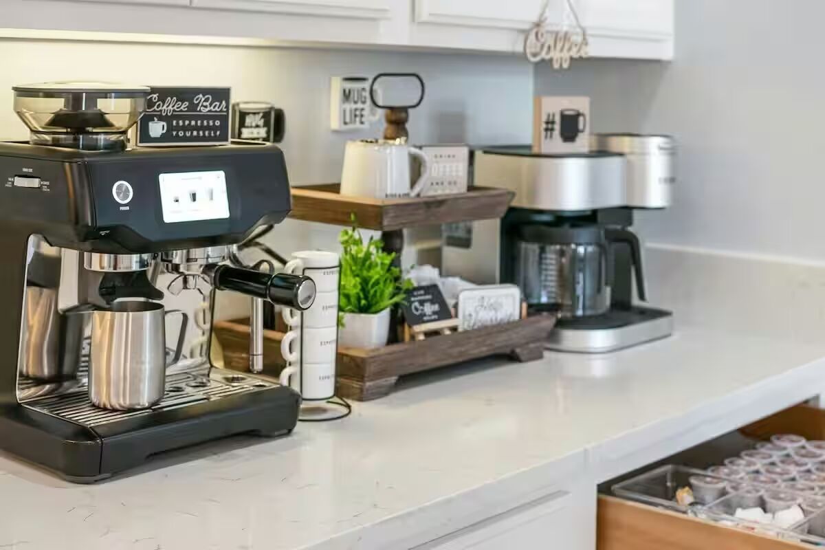 Gourmet Coffee Bar: Includes Breville Barista Touch Espresso machine, Keurig Duo, electric tea kettle, and an assortment of beverages.