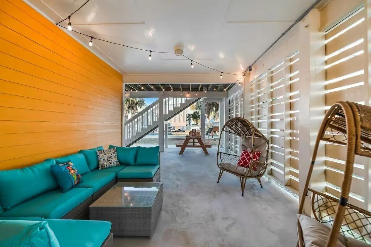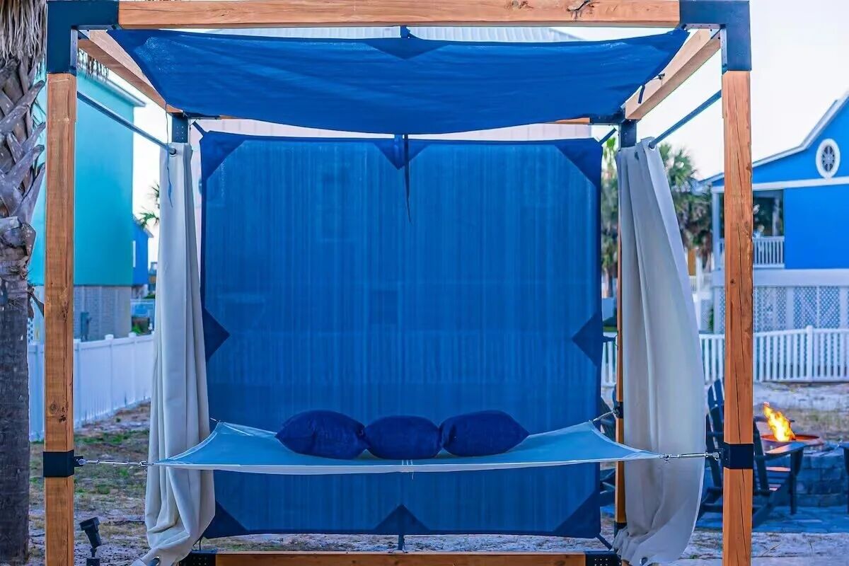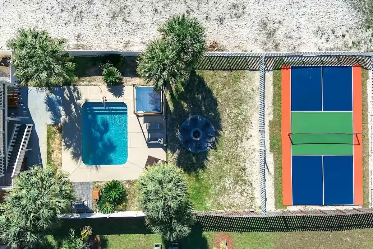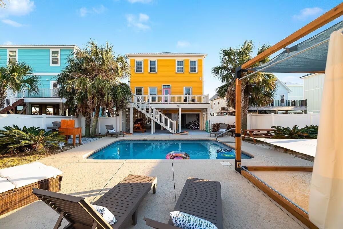Relax in the heated private pool or sip sunset cocktails at our vibrant tiki bar as you listen to your favorite music through the blue tooth sound system. As Gulf Shores' only property with a private pickleball court, you can enjoy leisurely fun right outside your door. Gather around the fire pit on cooler evenings for a cozy atmosphere perfect for s'mores and story-sharing or explore the scenic beauty of Gulf Shores using the complimentary bicycles.