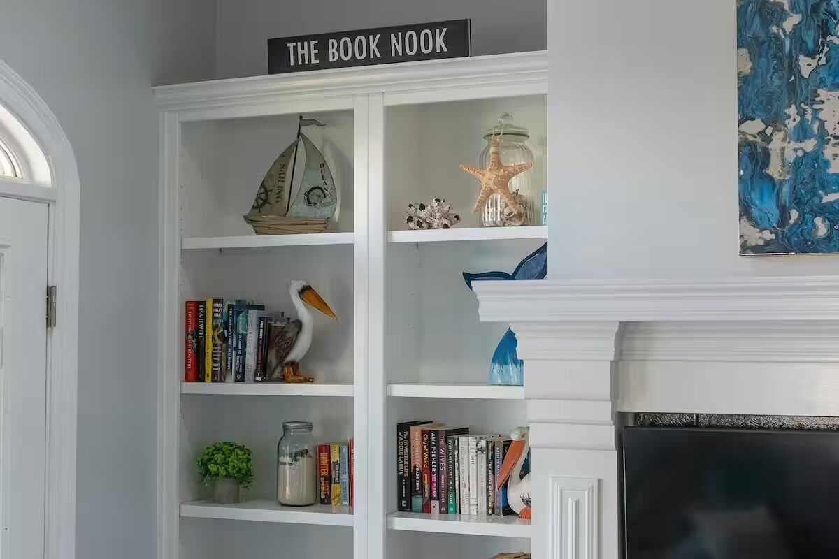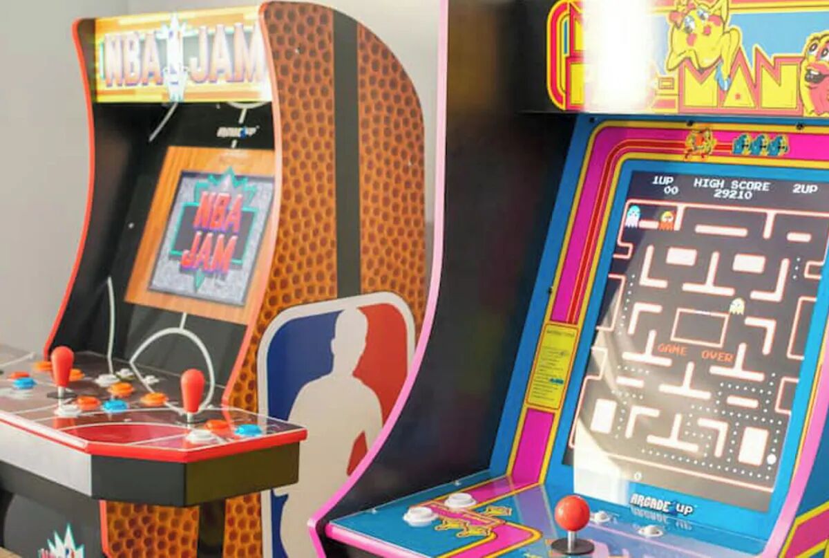 Entertainment Areas: Two living spaces featuring 65-inch smart TVs, arcade games, board games, and a cozy library nook.