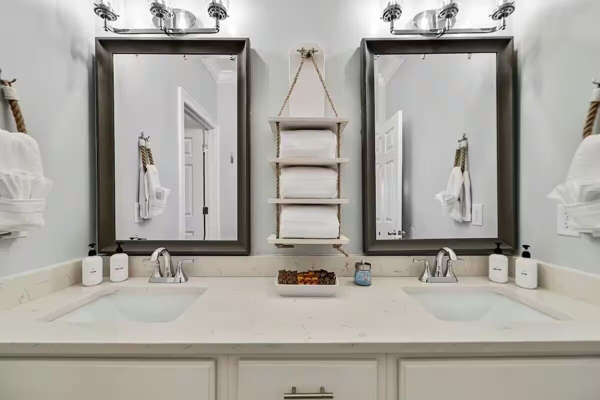 - Bathrooms: 5 total (3 full, 2 half; 1 half bath in garage for easy pool access). Essentials included (shampoo, body wash, hand soap, and towels).