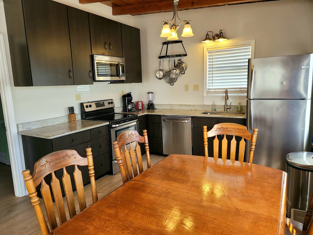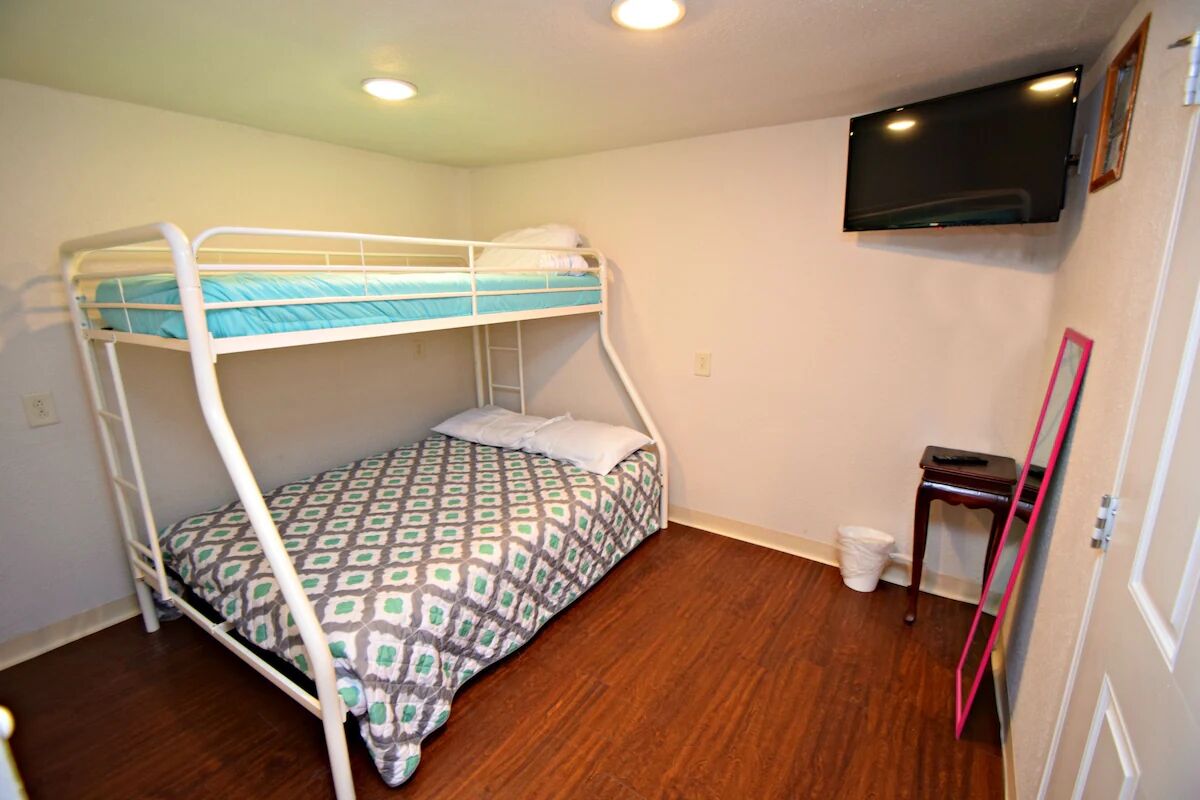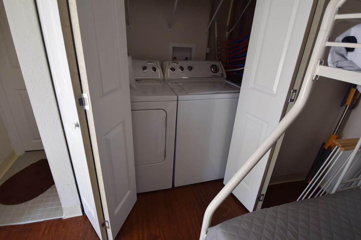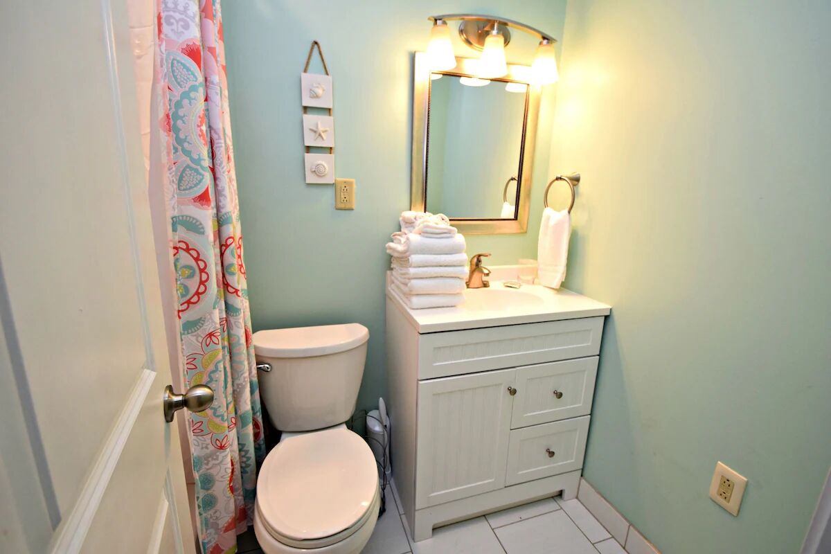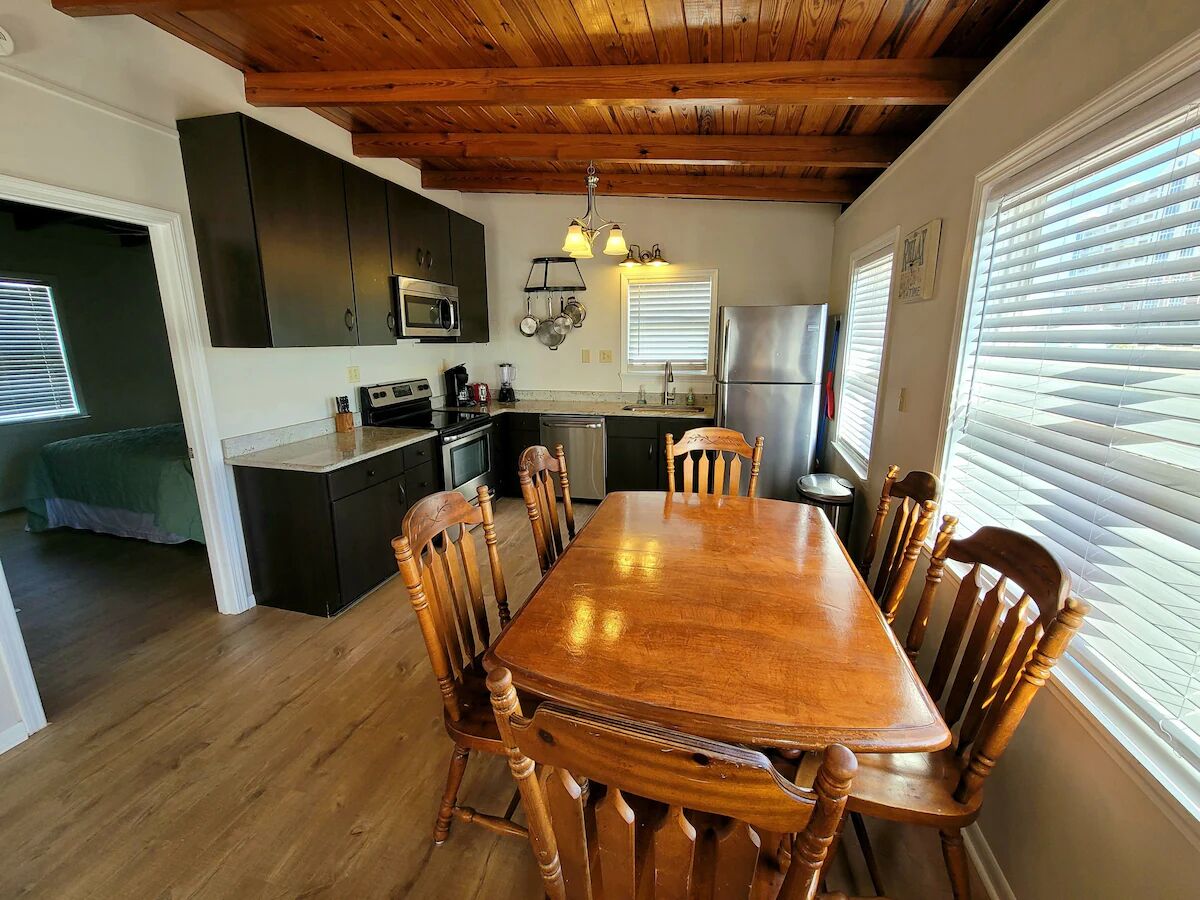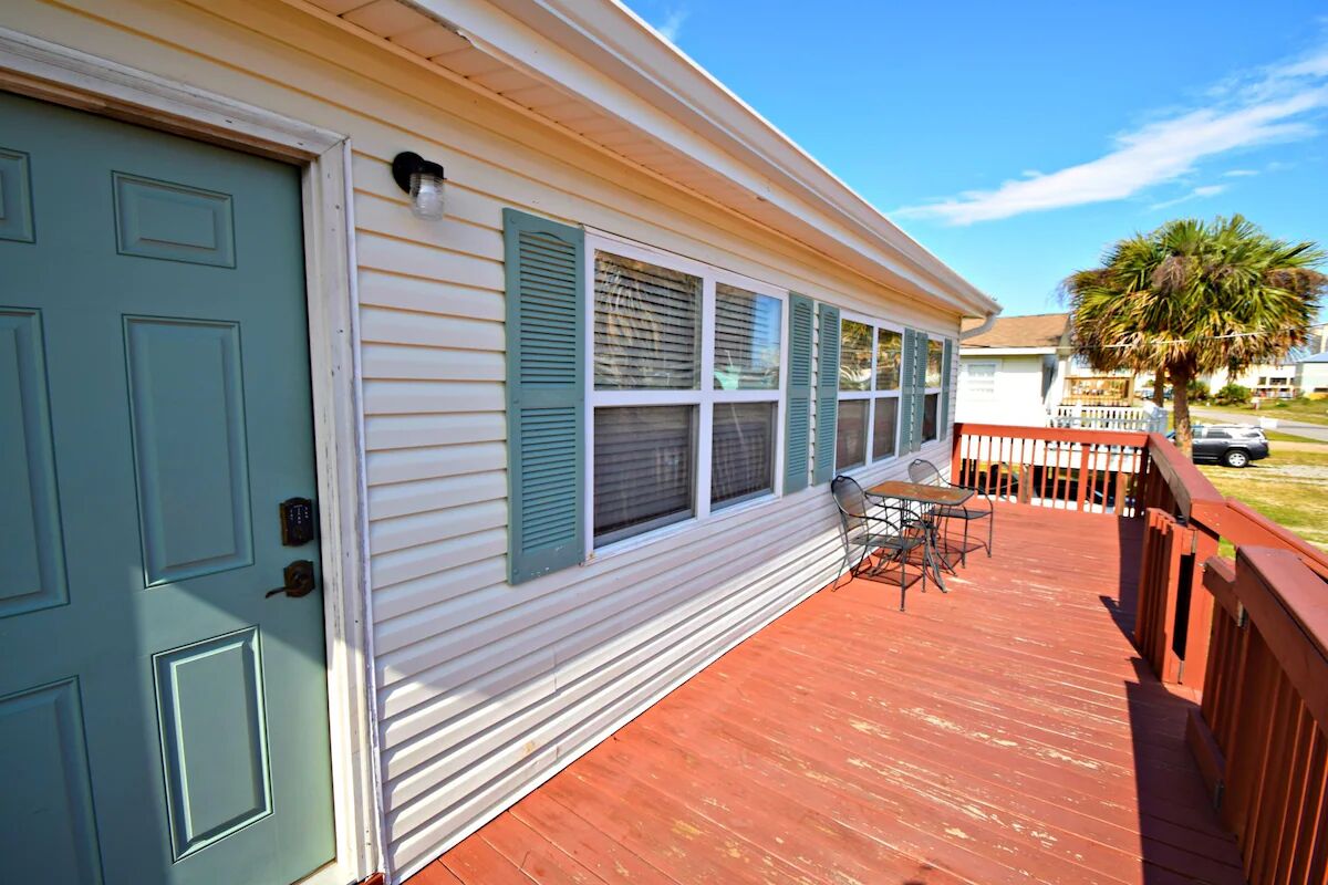 The main house upstairs has two bedrooms, both with queen beds, TVs, and private baths. There is a full kitchen, a large, spacious living area, and a South facing front deck. The other two bedrooms are downstairs and have a separate entry for each bedroom. There is a Jack & Jill bathroom joining the two rooms and both of the rooms have Full/Twin bunks and TV's. This gives the whole party space to relax after a fun filled day in the sun. There is not an entry to the main portion of the house- you do have to go up the stairs to enter the unit. This is a new rental that has just been fully remodeled so come enjoy the new paint, furnishings, and much more! See you at the beach!!